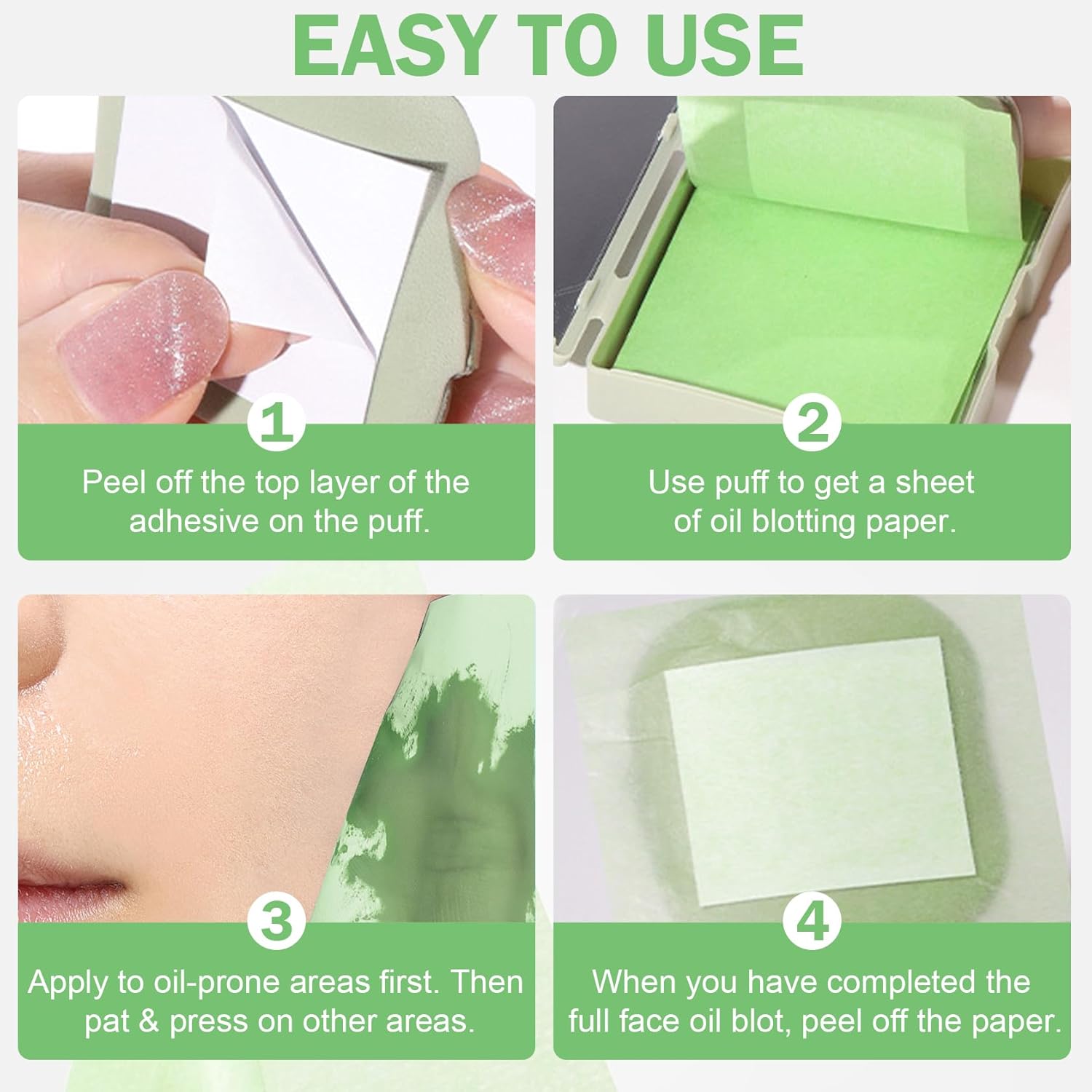 - 【How to Use】Peel off the adhesive sticker on the powder puff,use the puff to stick a piece of oil absorbing paper,press the forehead,nose, chin and the oil-prone parts first,and then tap and press other parts to complete the oil absorption of the whole face.